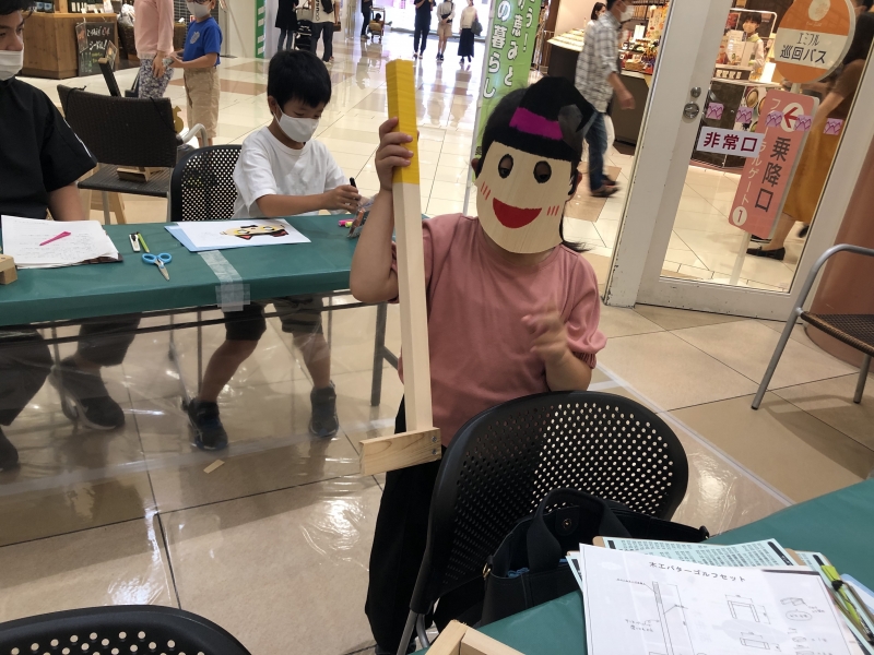 愛媛県の木材を使って、お家の中で遊べる道具を!と考えたのがパターゴルフとハロウィンモチーフのお面作りです。