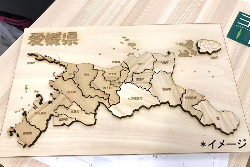 愛媛県には20市町があり、各市町の名称は言えると思いますが、それぞれの位置関係は意外と覚えていないものです。そこでパズルであれば楽しみながら、それも木工体験を伴えば一層学べると思った狙いは的中し、予備を含めた40個の「えひめ県パズル」は2日間で全て出尽くしてしまいました。