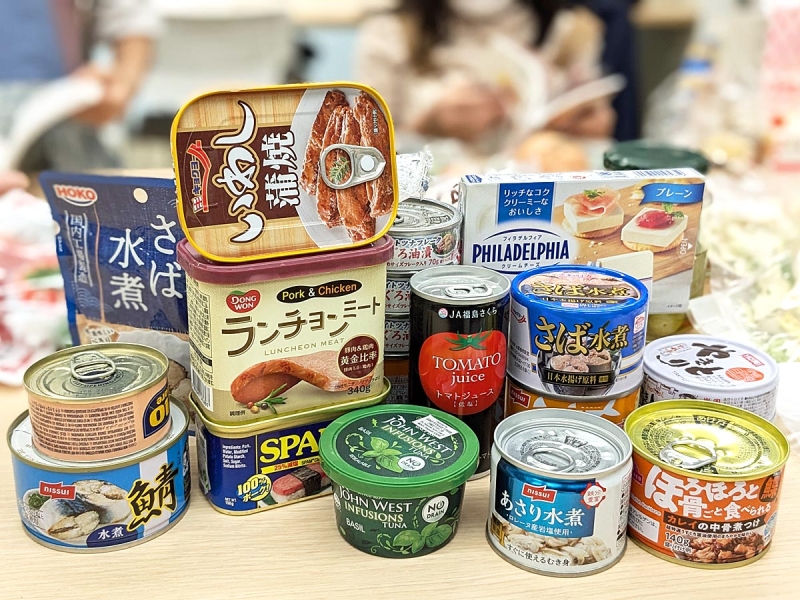 持ち込まれた缶詰は「サバの水煮、アサリの水煮、バジルの味付けツナ、レモン漬ツナ、イワシの蒲焼、焼き鳥、スパム、カレイの中骨煮付け、ポーク&チキン」など。